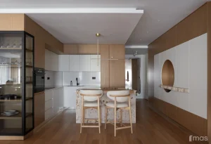 U kupatilima kombinacija svijetlih i tamnih tonova daje prostoru elegantan i sofisticiran izgled. Upotreba drveta, kamena i keramike doprinosi prirodnoj i toploj atmosferi. Prirodni materijali u arhitekturi nisu samo estetski izbor — oni predstavljaju most između čovjeka i prirode, unoseći toplinu, teksturu i dugotrajnost. Zidne pločice sa geometrijskim uzorcima u toplim nijansama dodaju osjećaj ritma i živosti, dok okruglo ogledalo dodatno naglašava ponavljajući motiv zaobljenih formi.