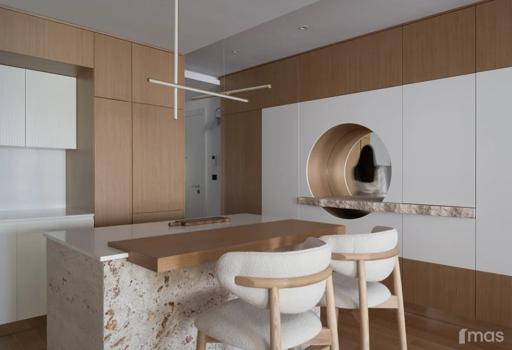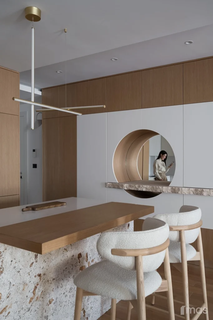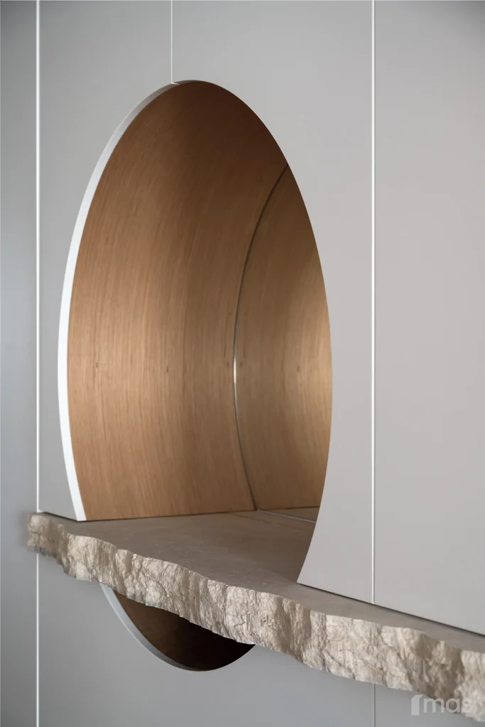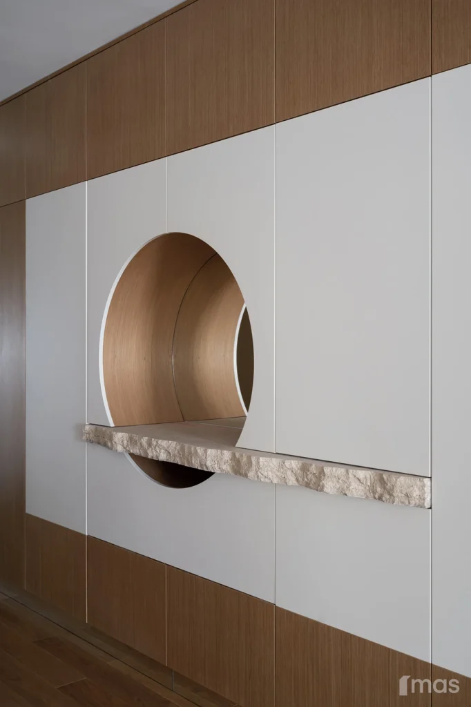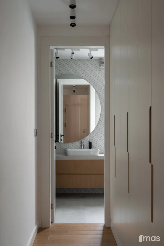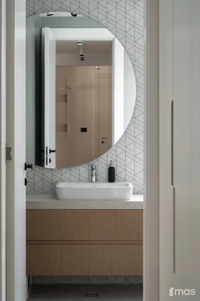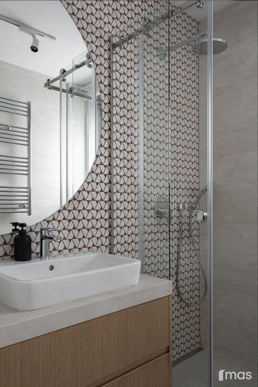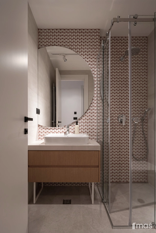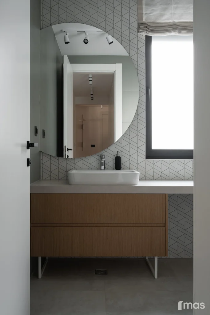 In the bathrooms, a combination of light and dark tones gives the rooms an elegant and sophisticated appearance. The use of wood, stone, and ceramic contributes to a natural and warm atmosphere. Natural materials in architecture are not just an aesthetic choice—they serve as a bridge between people and nature, bringing warmth, texture, and longevity. Wall tiles with geometric patterns in warm hues add a sense of rhythm and vibrancy, while a round mirror reinforces the recurring motif of curved shapes.