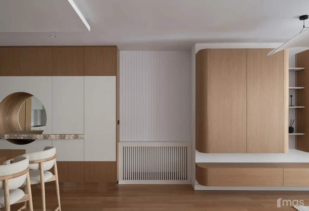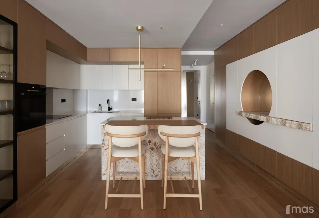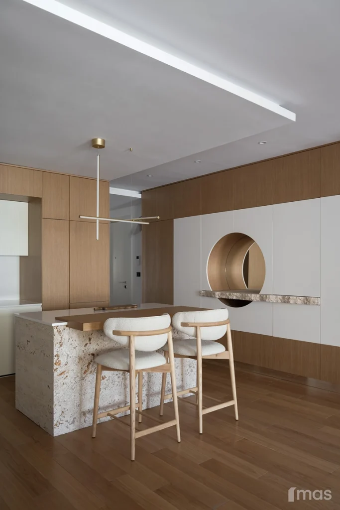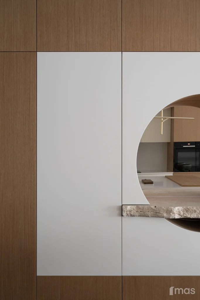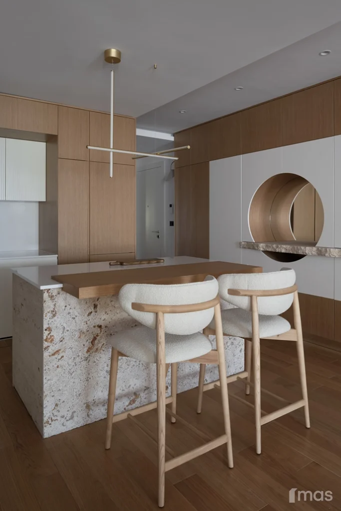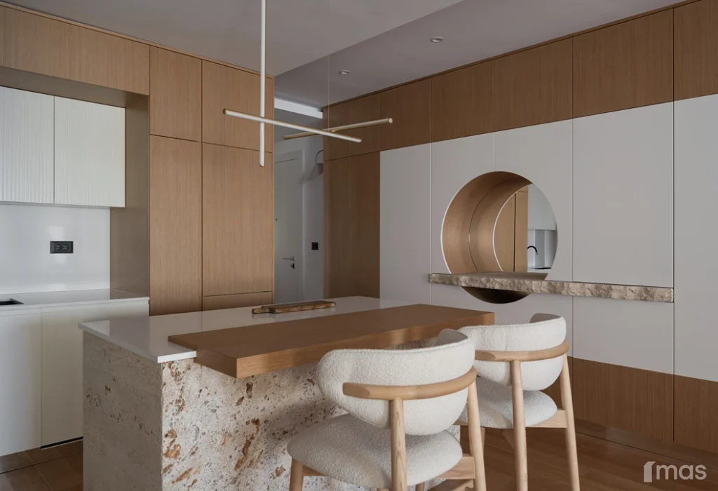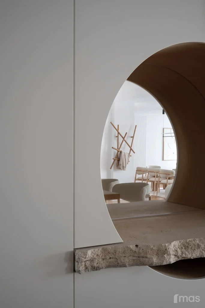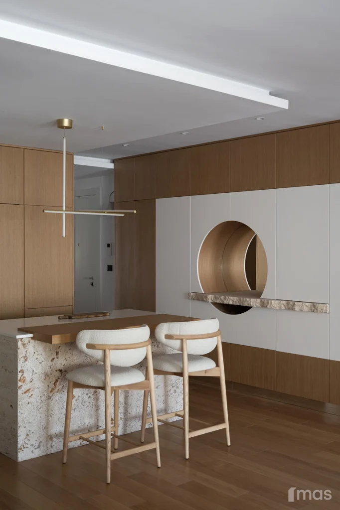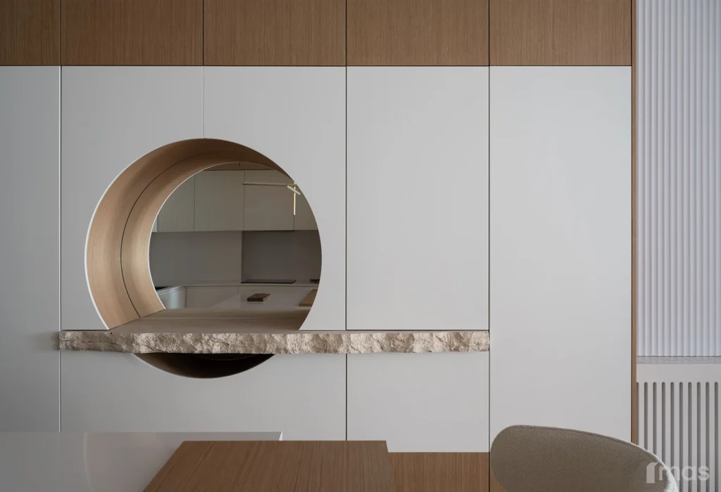 In the bathrooms, a combination of light and dark tones gives the rooms an elegant and sophisticated appearance. The use of wood, stone, and ceramic contributes to a natural and warm atmosphere. Natural materials in architecture are not just an aesthetic choice—they serve as a bridge between people and nature, bringing warmth, texture, and longevity. Wall tiles with geometric patterns in warm hues add a sense of rhythm and vibrancy, while a round mirror reinforces the recurring motif of curved shapes.
