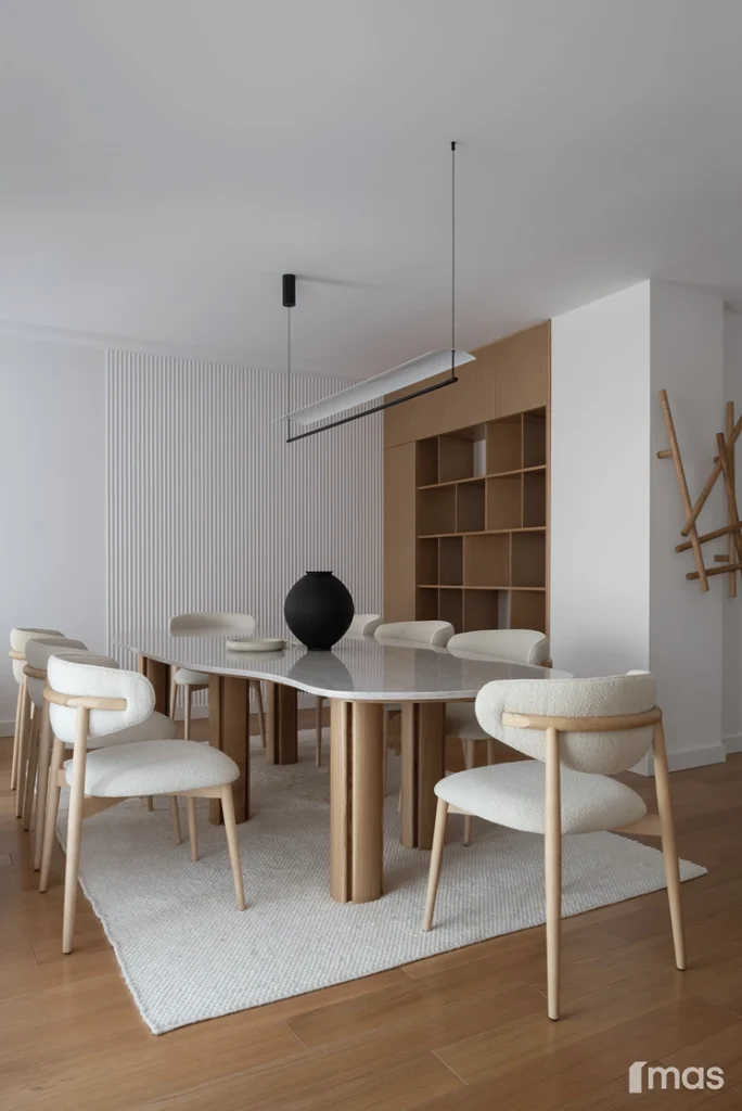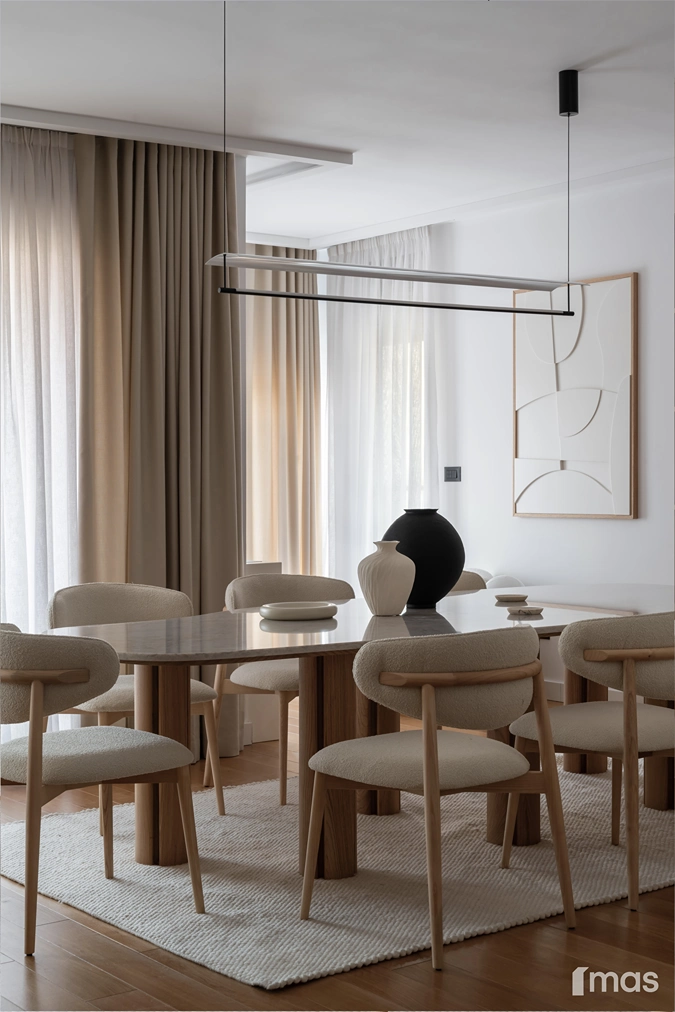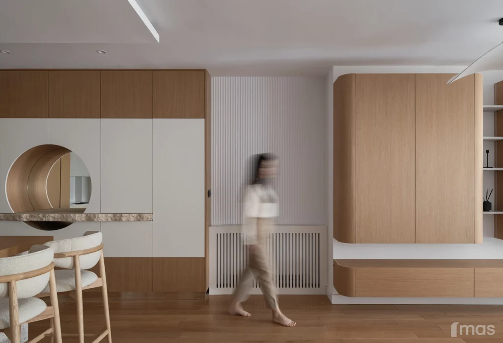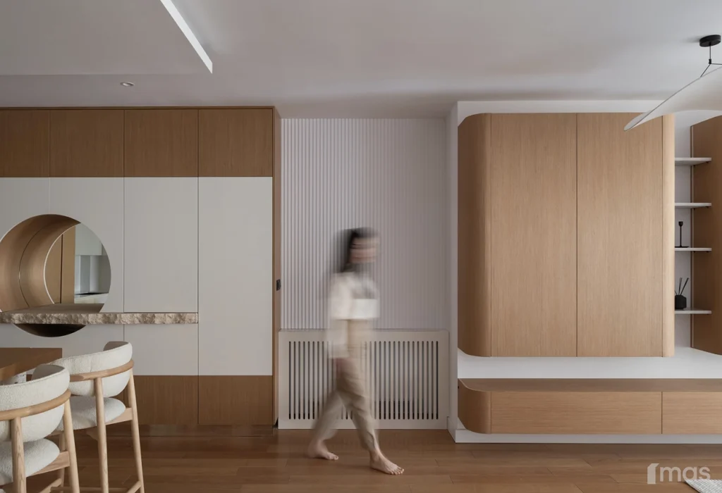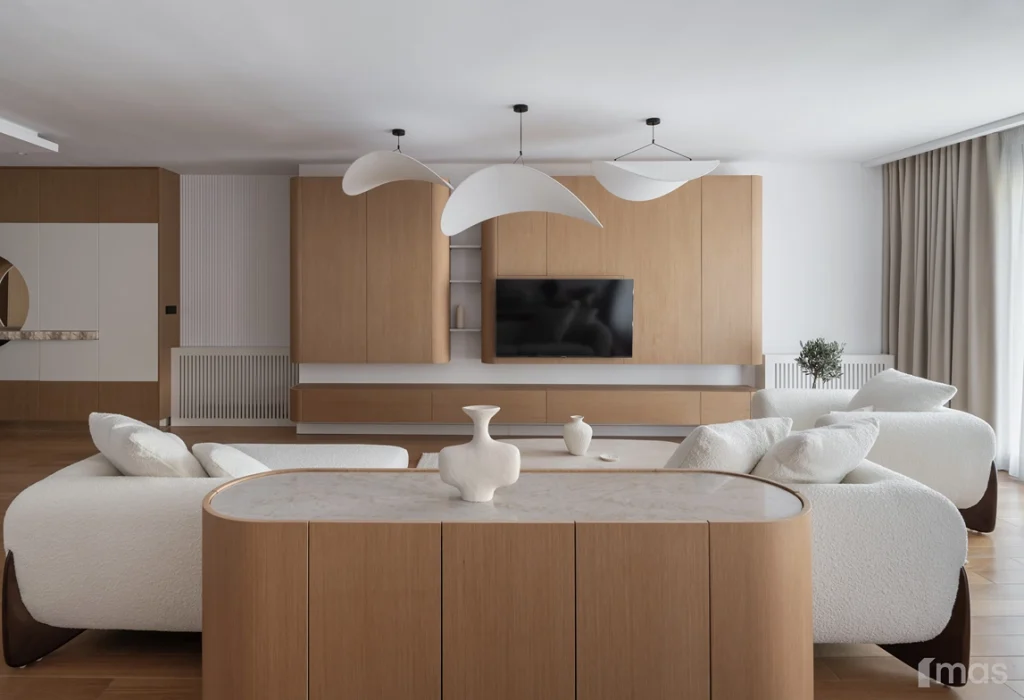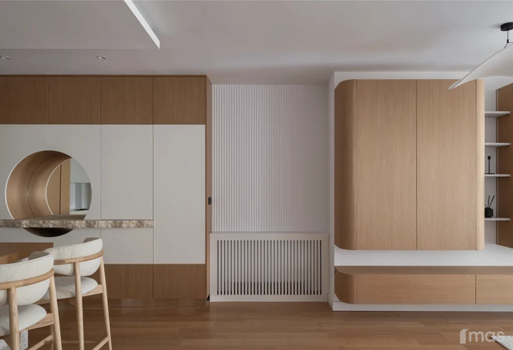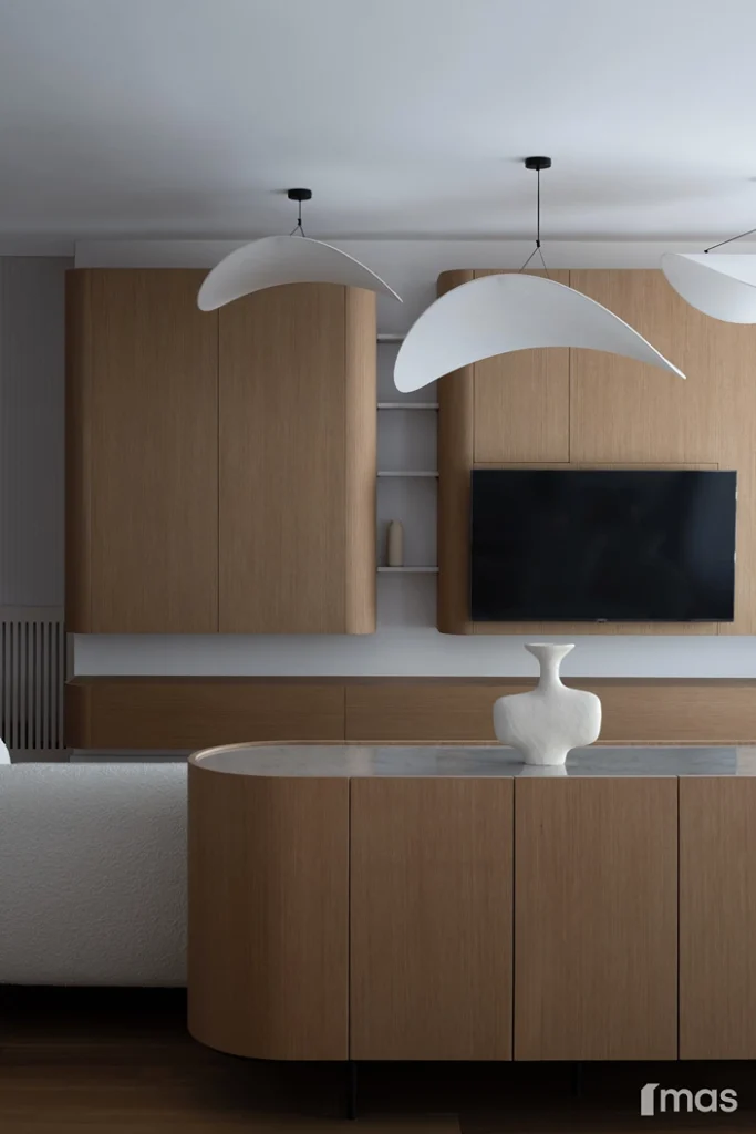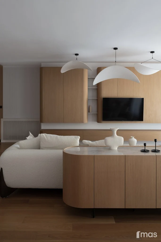 In the bathrooms, a combination of light and dark tones gives the rooms an elegant and sophisticated appearance. The use of wood, stone, and ceramic contributes to a natural and warm atmosphere. Natural materials in architecture are not just an aesthetic choice—they serve as a bridge between people and nature, bringing warmth, texture, and longevity. Wall tiles with geometric patterns in warm hues add a sense of rhythm and vibrancy, while a round mirror reinforces the recurring motif of curved shapes.