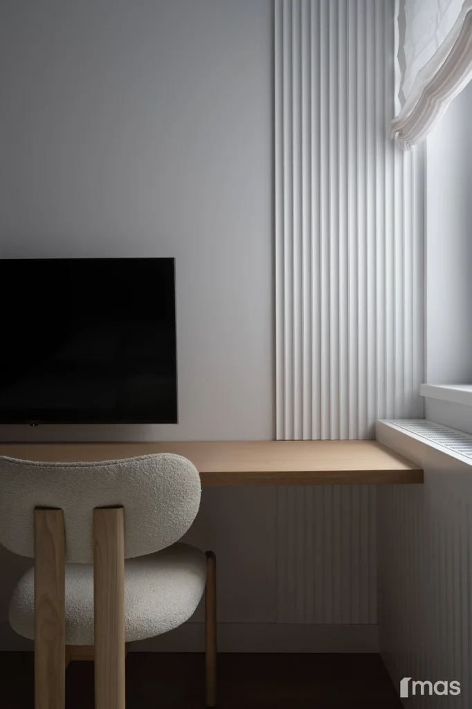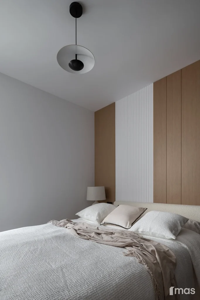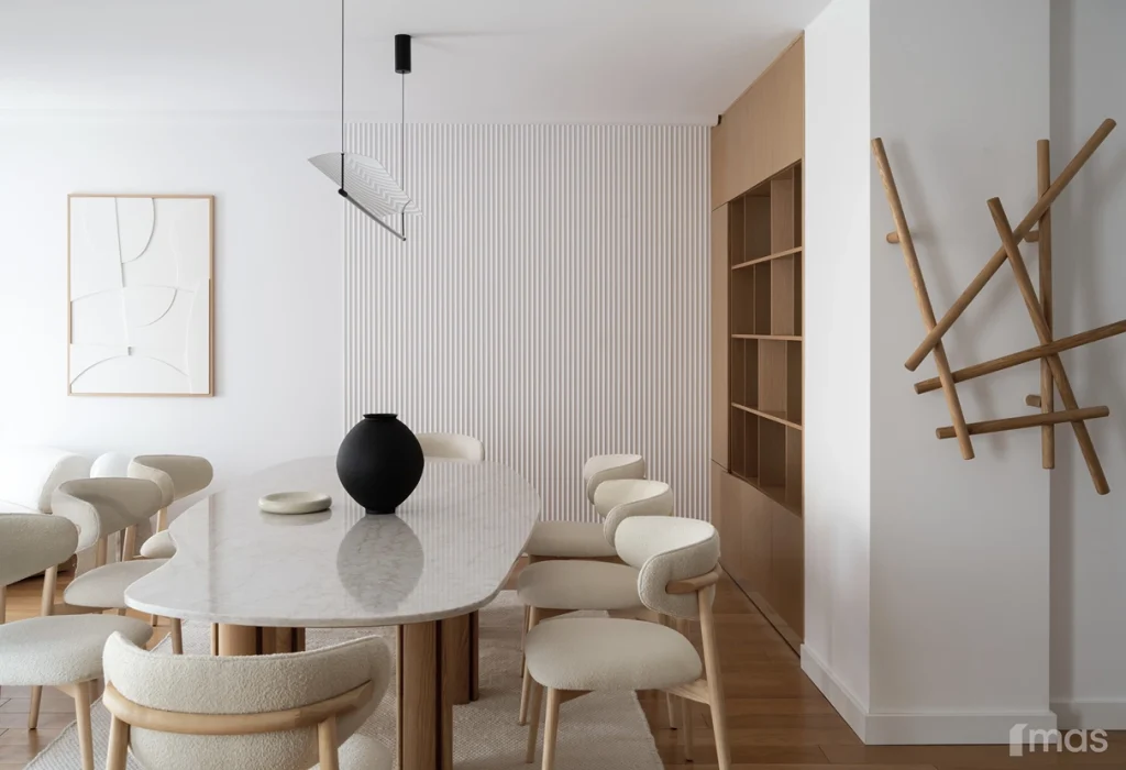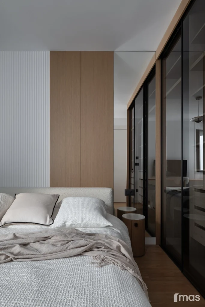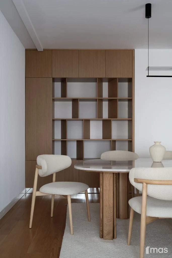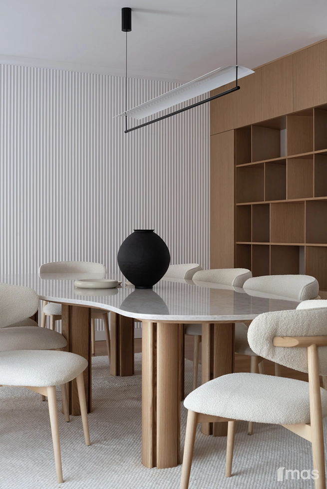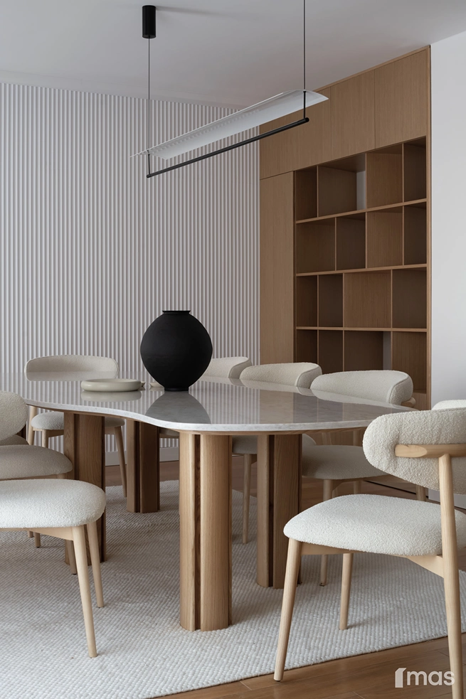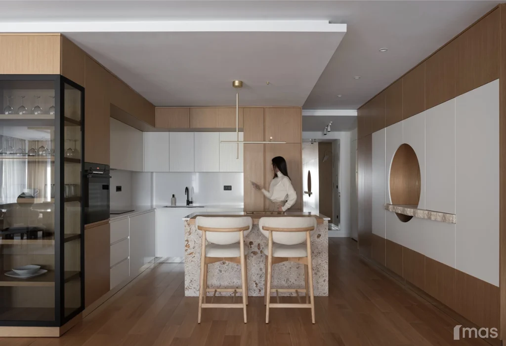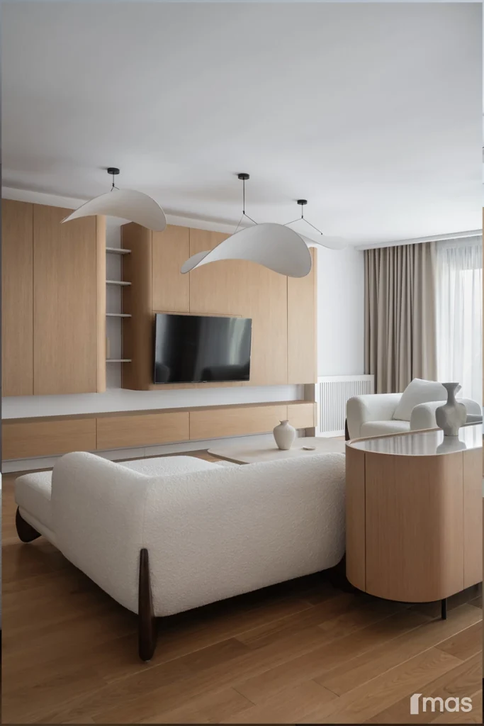 In the bathrooms, a combination of light and dark tones gives the rooms an elegant and sophisticated appearance. The use of wood, stone, and ceramic contributes to a natural and warm atmosphere. Natural materials in architecture are not just an aesthetic choice—they serve as a bridge between people and nature, bringing warmth, texture, and longevity. Wall tiles with geometric patterns in warm hues add a sense of rhythm and vibrancy, while a round mirror reinforces the recurring motif of curved shapes.