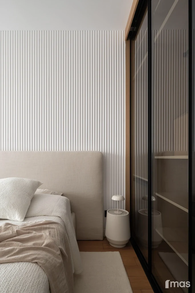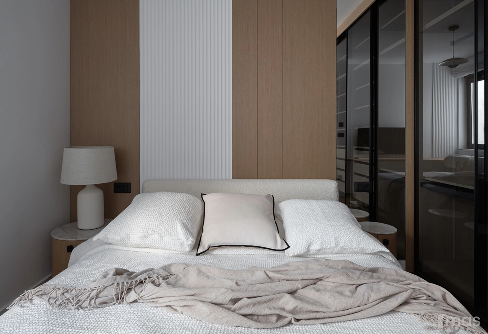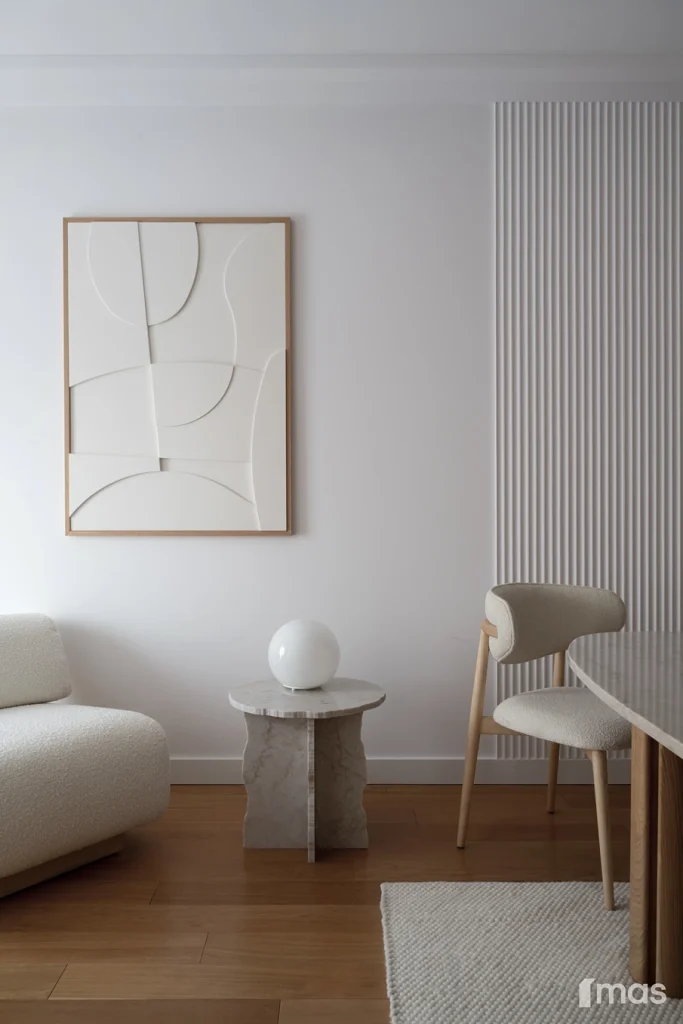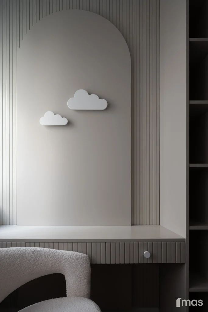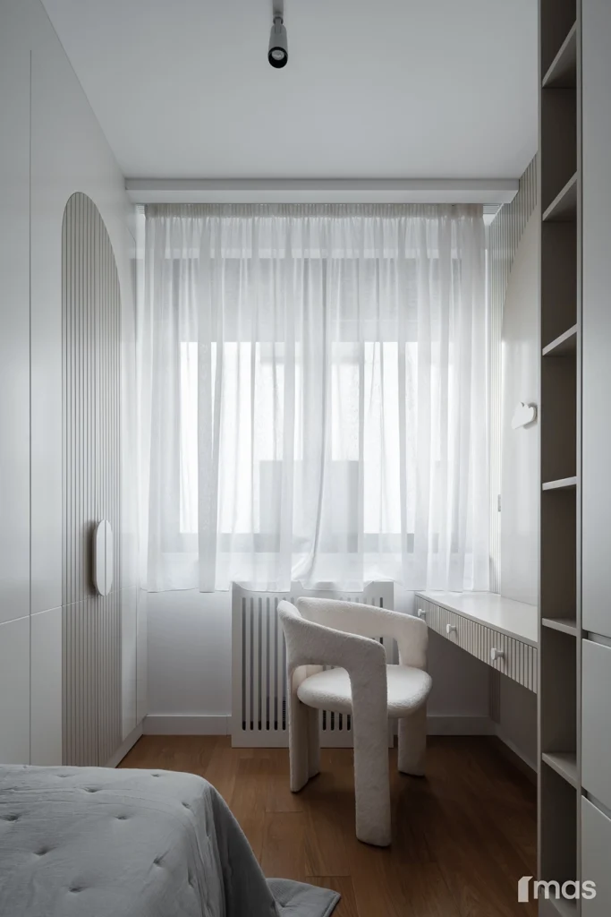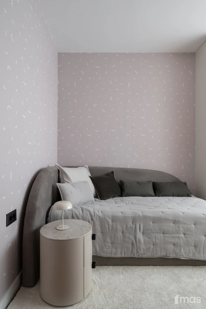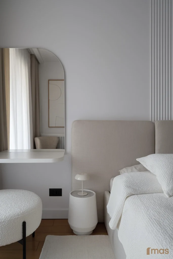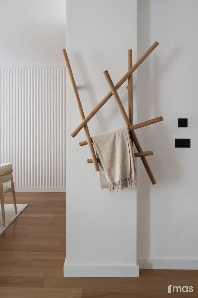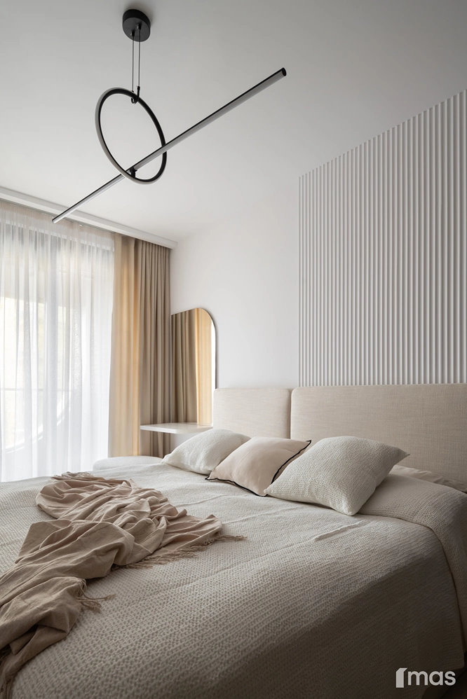 In the bathrooms, a combination of light and dark tones gives the rooms an elegant and sophisticated appearance. The use of wood, stone, and ceramic contributes to a natural and warm atmosphere. Natural materials in architecture are not just an aesthetic choice—they serve as a bridge between people and nature, bringing warmth, texture, and longevity. Wall tiles with geometric patterns in warm hues add a sense of rhythm and vibrancy, while a round mirror reinforces the recurring motif of curved shapes.